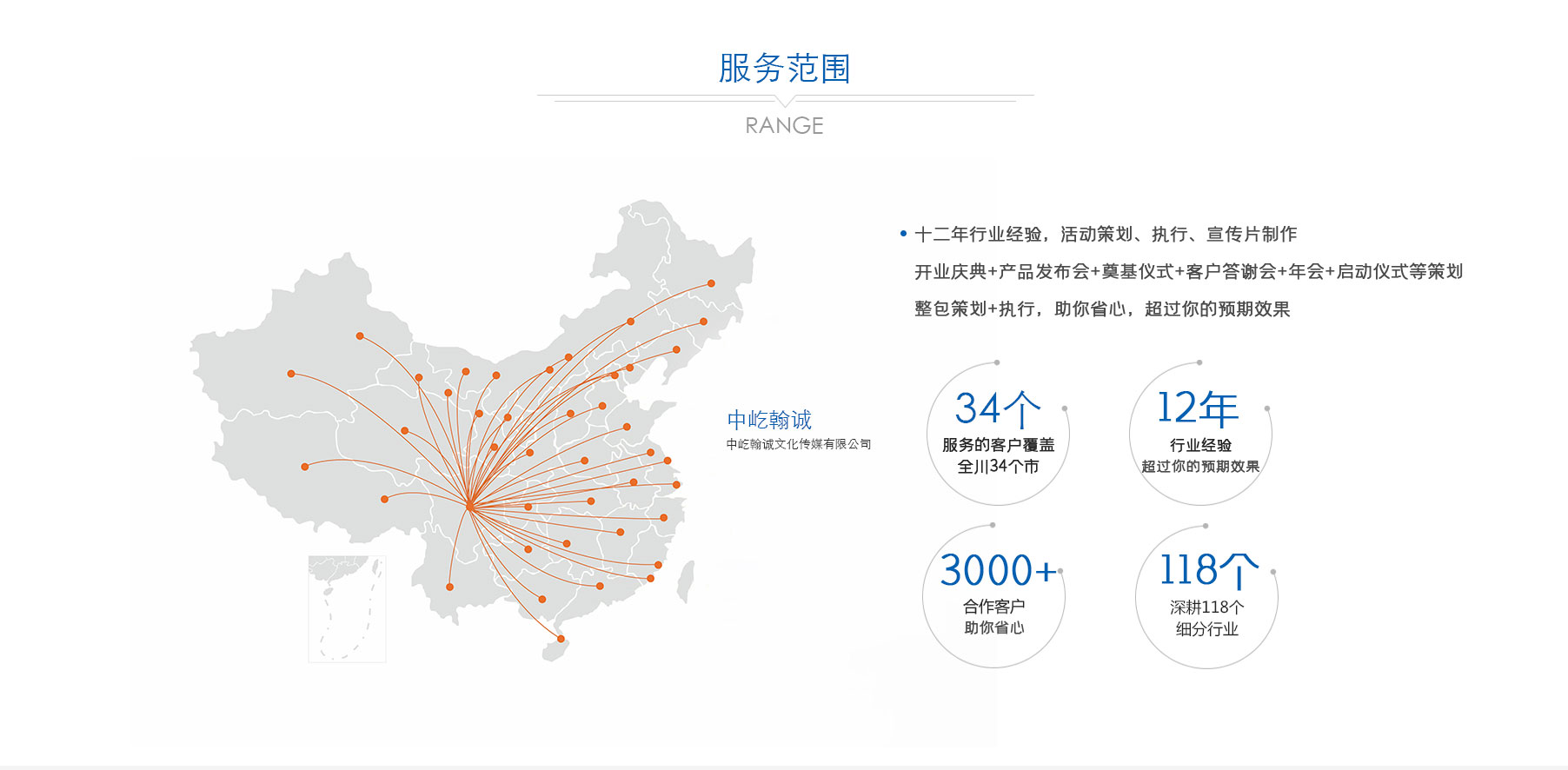 歷經(jīng)多年深耕,公司已形成 “公關(guān)活動(dòng)、展覽展示、品牌戰(zhàn)略服務(wù)、影視制作” 四大核心業(yè)務(wù)板塊。從創(chuàng)意策劃到落地執(zhí)行,從品牌塑造到視覺呈現(xiàn),從活動(dòng)運(yùn)營到影像記錄,中屹翰誠始終以專業(yè)視角與創(chuàng)新理念,滿足客戶多元化需求。憑借出色的服務(wù)品質(zhì)與專業(yè)能力,公司在市場中穩(wěn)步前行,服務(wù)版圖已拓展至政府、金融、媒體、演藝、建筑等 118 個(gè)細(xì)分行業(yè),與超 3000 家客戶建立深度合作關(guān)系,以實(shí)力贏得廣泛認(rèn)可與信賴。